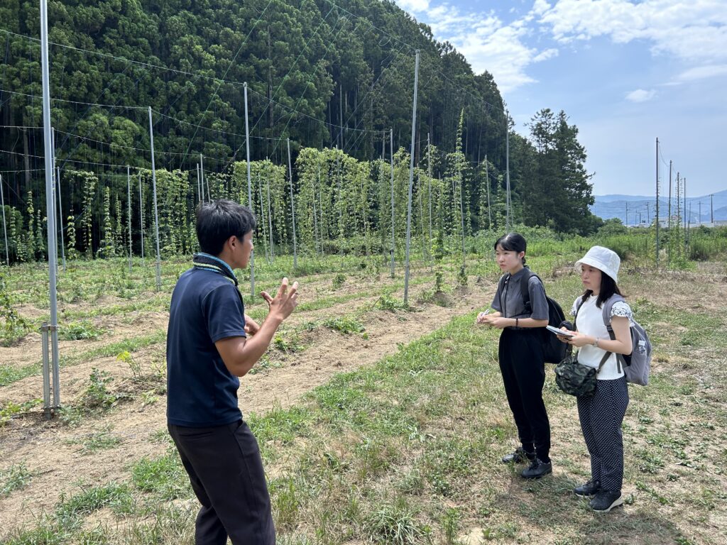 今回は収穫終わりに訪問させて頂きましたが、収穫の時期にはホップの苗が所狭しに並ぶグリーンカーテンが圧巻であるそうです。実際にホップが栽培されている農地の見学だけに留まらず、インタビューにも資料を見させて頂きながら、丁寧にお答えいただきました。中でも、摘みたてのホップを用いた、ホップサイダーは爽快でした。