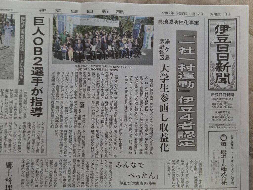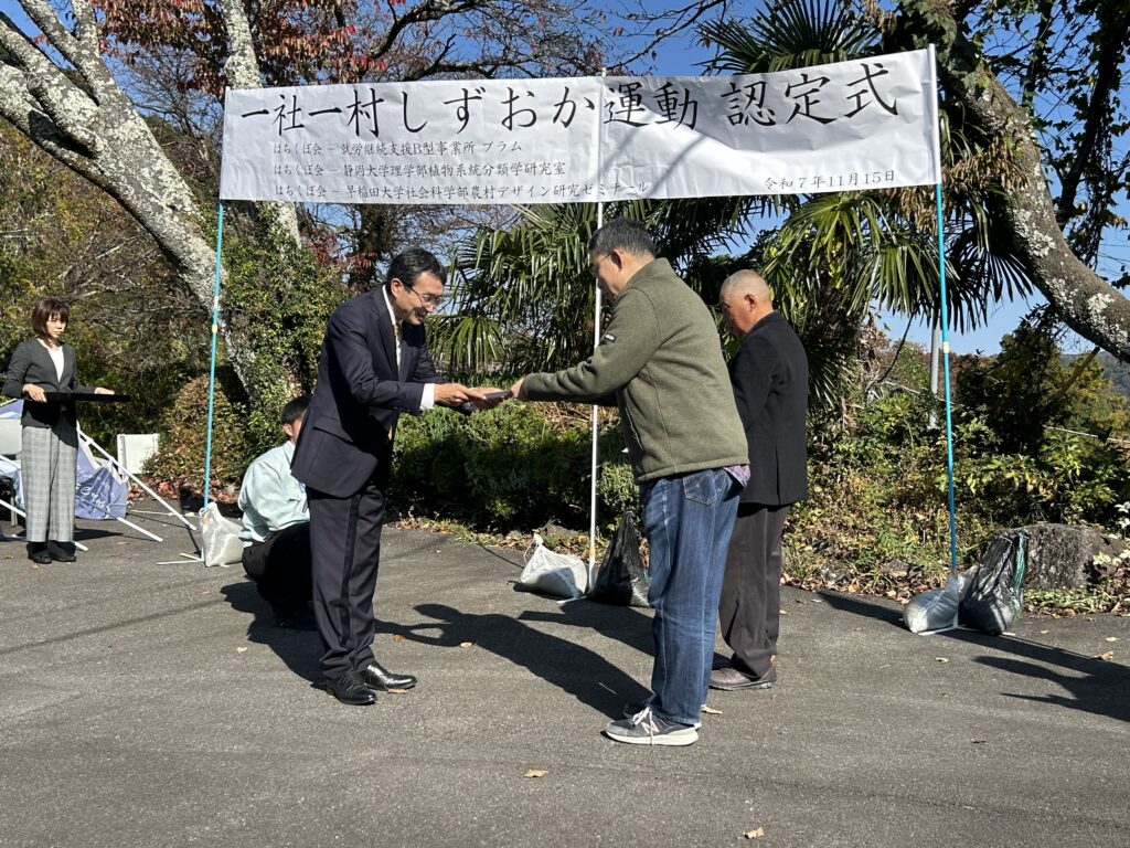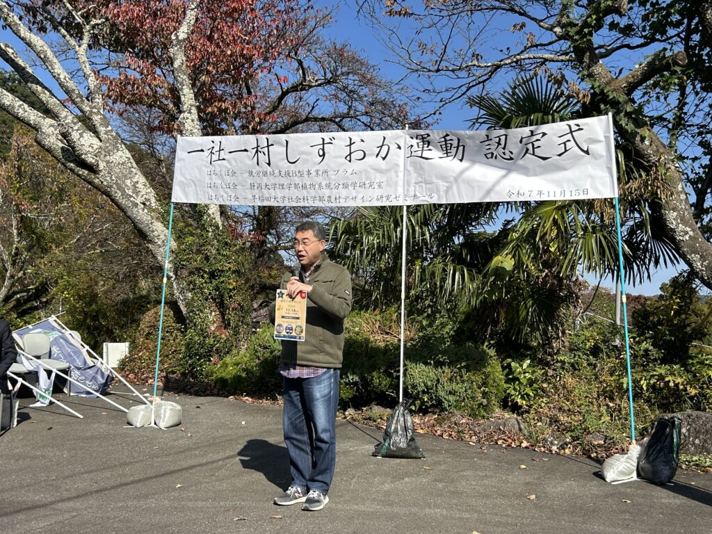 2025年11月15日(土)に,いつもゼミでお世話になっている静岡県伊豆市茅野地区にて,静岡県が実施している「一社一村しずおか運動」に茅野地区の「はちくぼ会」と早稲田大学社会科学部農村デザイン研究ゼミナールとが認定され,その認定式が開催されました。