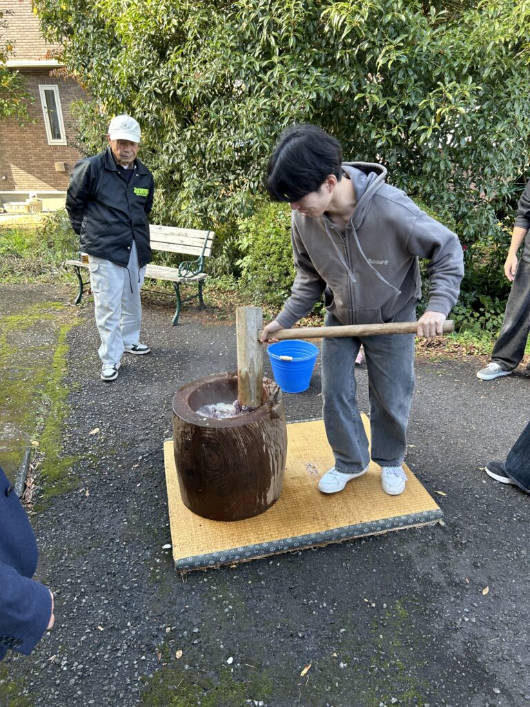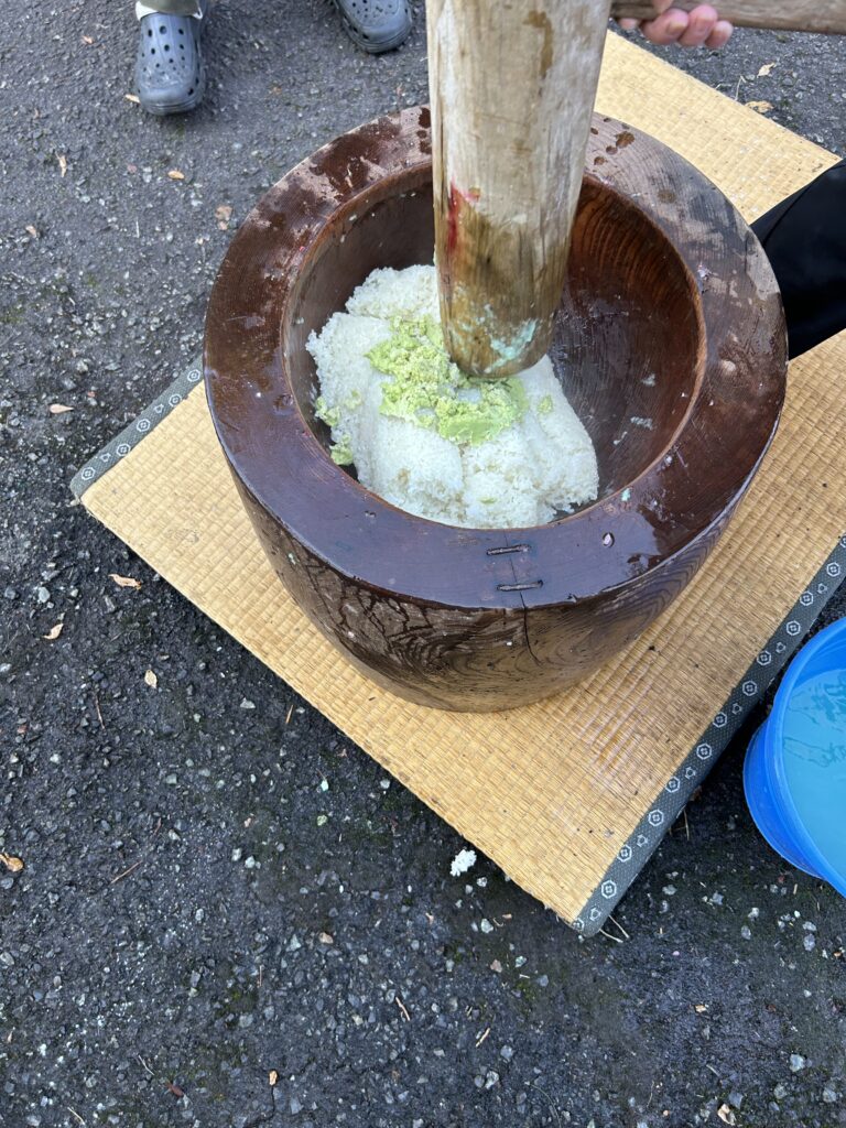 学生やゼミOBはお餅つきもさせていただきました。お餅つきでは,茅野地区のある湯ヶ島地域特産のわさびをふんだんに練りこんだお餅もつかれていました。